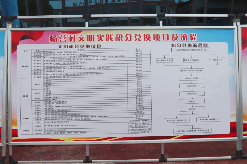 “咱们接着看这一版块儿啊,项目就是‘移风易俗’,针对的就是婚事新办、丧事简办、禁毒禁毒、崇尚科学、礼金合规、文明捡拾,还有负面清单这些内容,意思是啥呢,比如说咱家孩子要结婚了,你主动跟村里报备下,好,加分;再一个呢,你不给人家要高额的彩礼,好,再加分;然后办酒席,你不铺张不浪费,咱还加分。但是,如果你做不到,那咱就对着着这表,一项一项扣分,最后到月底的时候,分数不高,得不到奖励,那你别眼红人家,而且咱们这加分、扣分原因还会公布出来,让大家都看看。这一项,大家听明白没?有问题的来现场说……”6月26日,在卧龙区蒲山镇杨营村新时代文明实践广场上,杨营村党支部书记和几位负责同志,对照着杨营村文明实践积分兑换项目及流程,逐项为村民们解疑释惑。
