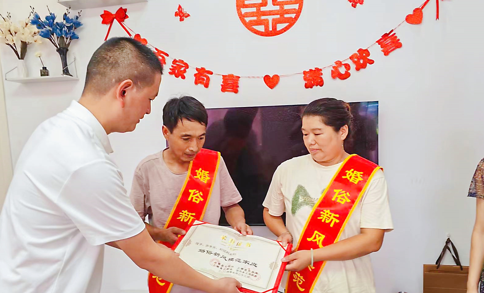 婚礼前一天,上蔡县民政局副局长梁文革带领工作人员专程前往苏争光、刘现利夫妇家中,为其颁发了由上蔡县文明办、民政局、妇联会和百尺乡政府联合颁发的“婚俗新风模范家庭”荣誉证书,引导广大群众树立正确的婚姻观念,摒弃高额彩礼等不良习俗。