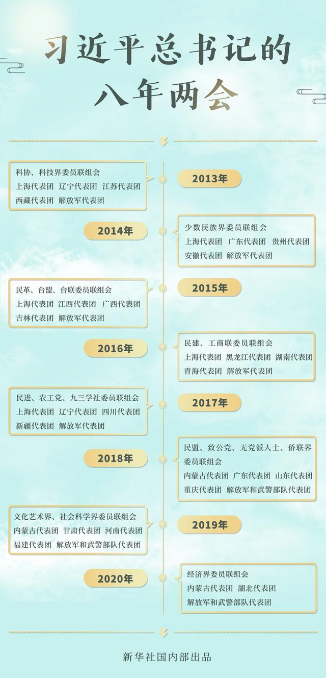 2013-2020,八年的全国两会上,总书记46次到团组参加审议讨论。交流之中,语重心长;言谈之间,发人深思。