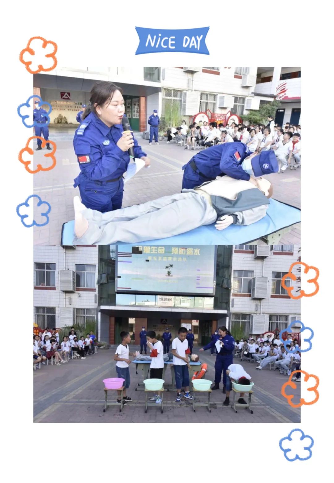 同学们积极与宣讲员互动,在王佳老师的指导下演示了如何正确用长杆和救生圈救助他人,利用人体模型学习了心肺复苏和人工呼吸的方法,提高了同学们的自救互救能力。