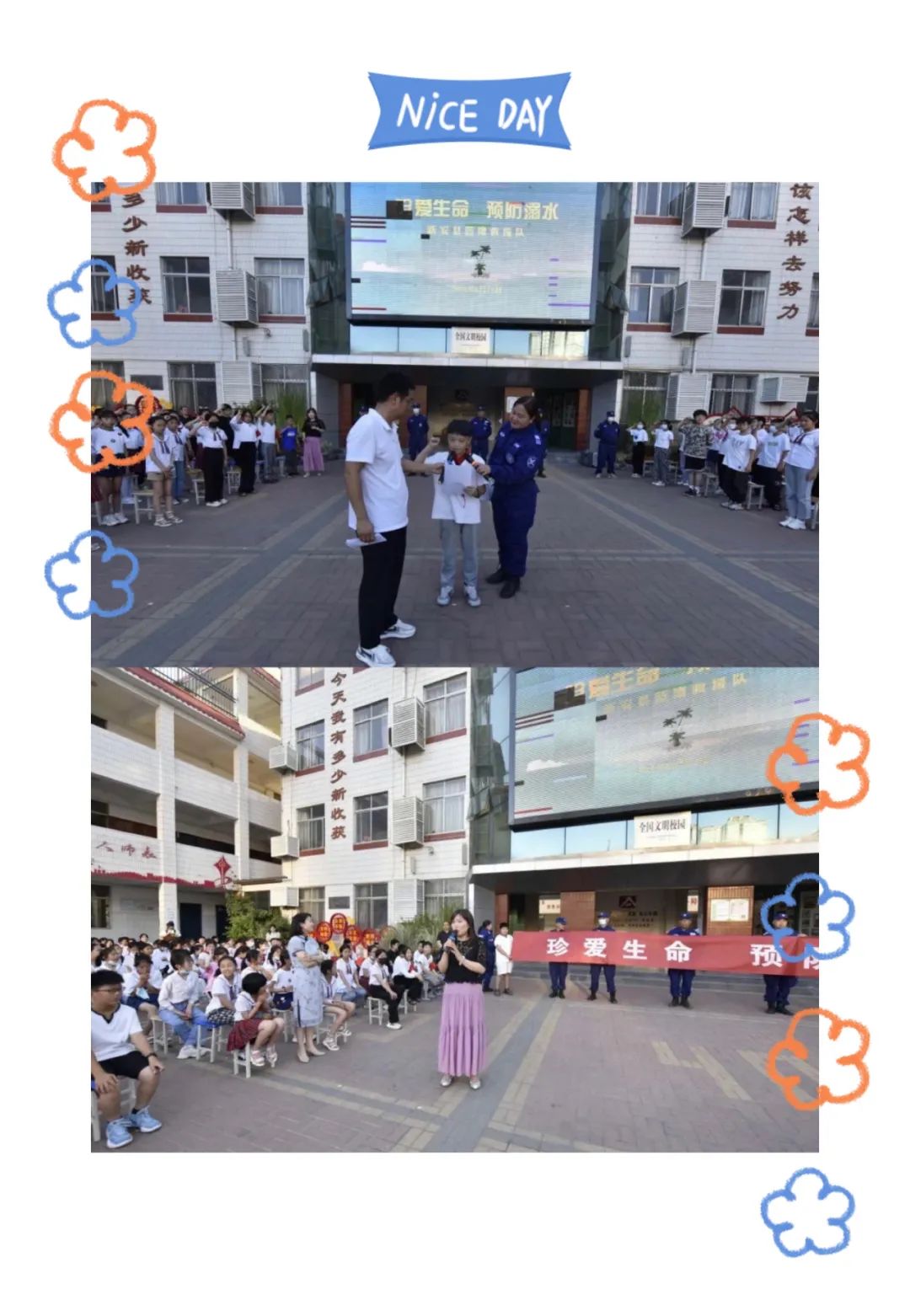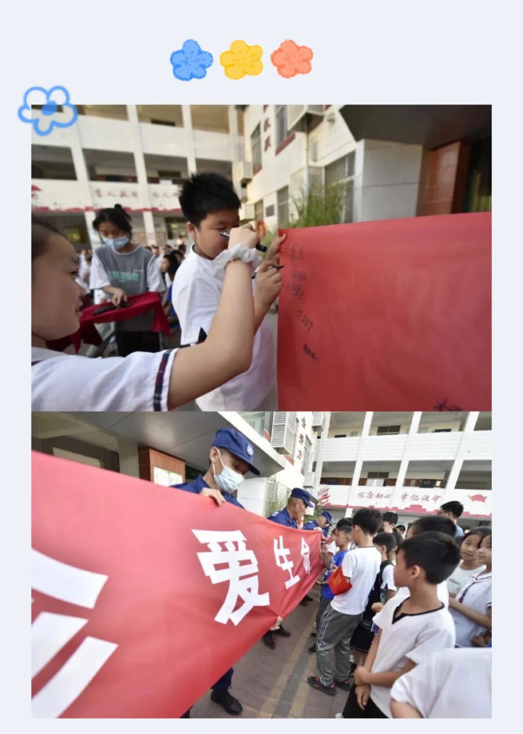 各班派出十位代表到台前进行“珍爱生命,预防溺水”的签名仪式。