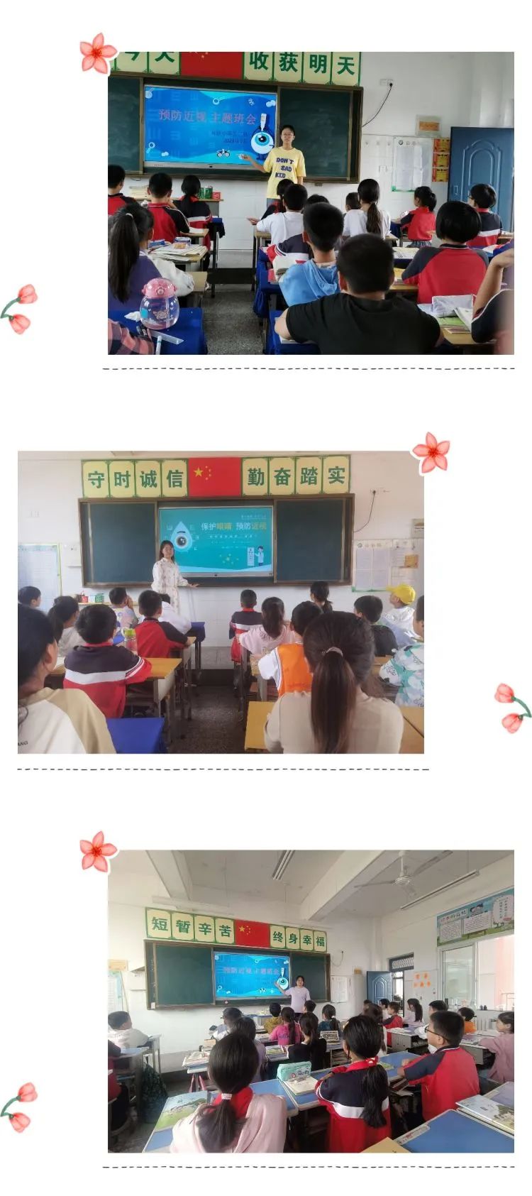 该校结合各个学段的健康课大纲要求,利用班会课,让班主任给同学们上了一节预防近视的健康课,从产生近视的原因、治疗和预防等方面对学生进行详细的讲解,重点对保护眼睛的基本常识(如坐姿看书、眼保健操、眼部的调节等)进行示范指导,并通过形象生动的举例说明使学生掌握科学用眼知识,培养学生良好的用眼习惯,降低青少年近视率。通过晨会、学校红领巾广播站等向全校师生进行了爱眼护眼常识的教育,加强广大师生保护眼睛的意识。