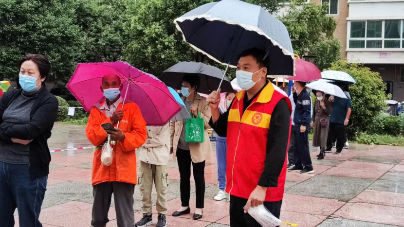 8月27日新安县在主城区、五头镇辖区开展第二轮区域全员核酸检测。核酸检测中,淅淅沥沥的小雨下个不停,但新安县800余名志愿者和医护人员在雨中坚守,从早上7点到12点,用责任心和爱心搭建起为群众遮风挡雨的“防护伞”。