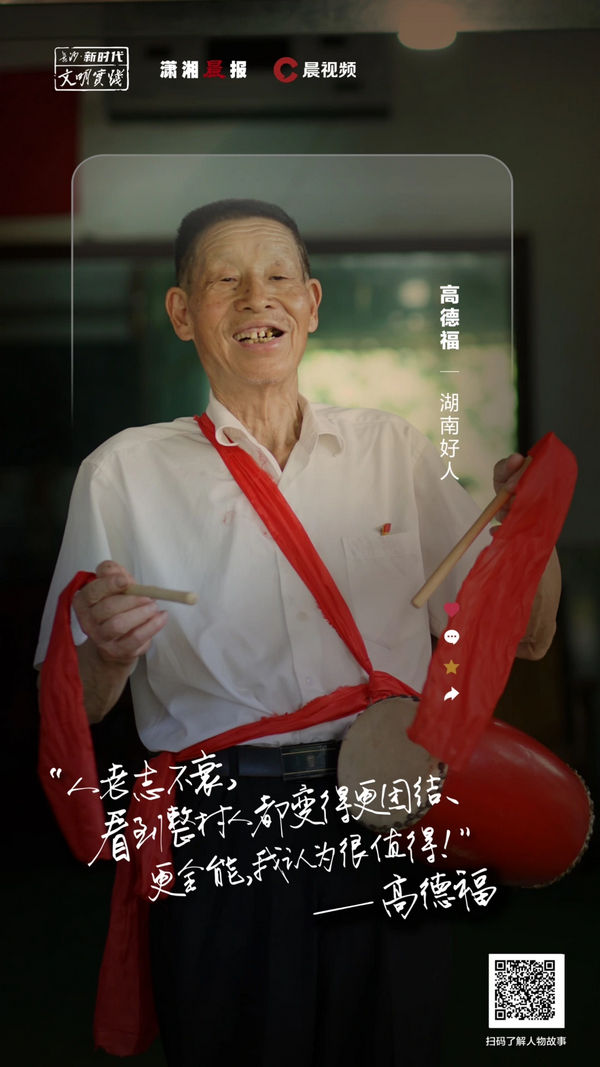 别看高龄,高德福却是其所在仙人市村文艺生活的头号功臣。退休二十多年来,“腰鼓、花棒舞、柔力球、太极拳……”他与妻子自学再义务教给其他村民的各类项目,双手都数不过来。高德福还发起“五老”志愿者队,“五老”宣传队,队员们信任他,共同将整个村子维护得干净整洁,村风良善。高德福也因此多次被评为市、县级先进个人,并获评2024年助人为乐类湖南好人。