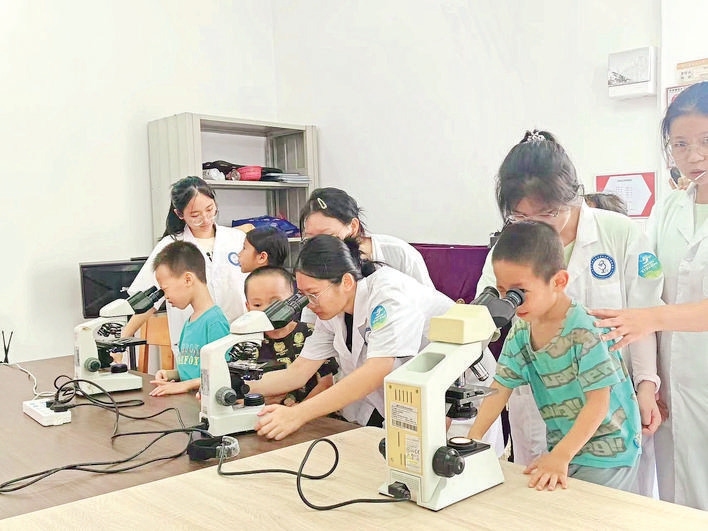 孩子们通过显微镜观察蛔虫卵,认识个人卫生的重要性。 惠州日报记者彭红霞 通讯员黄婧 林健 摄