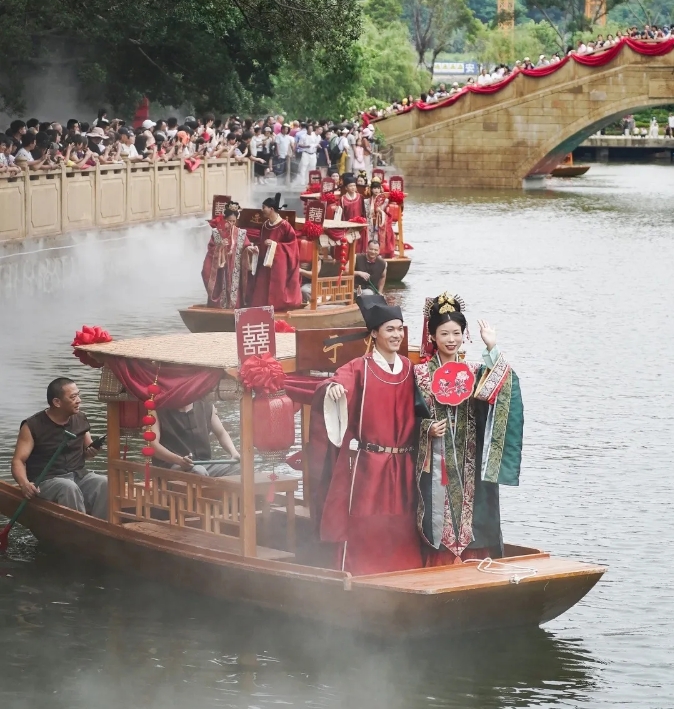广东广州在历史beplay官网app 街区融德里举行宋韵水上集体婚礼。