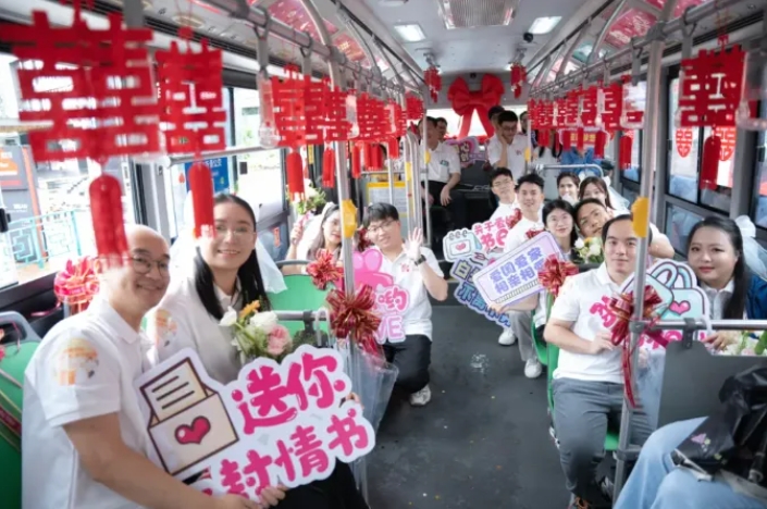 在广东肇庆市,新婚夫妇乘坐“520”爱情专线,游历爱情之旅,沿途接受全市祝福。