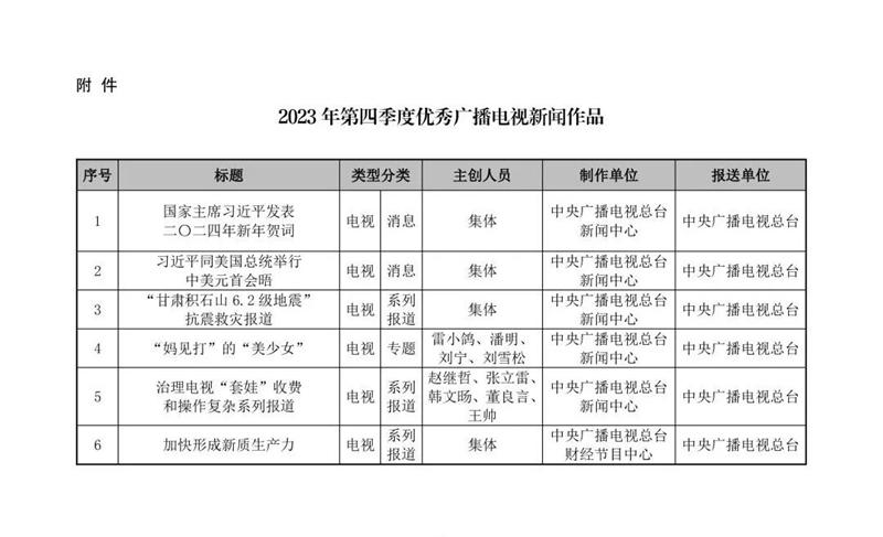 广电总局公布2023年第四季度优秀广播电视新闻作品
