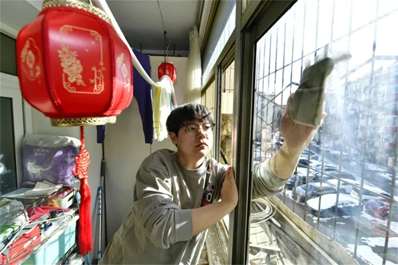 王宇鹏在家做家务。首都文明办供图