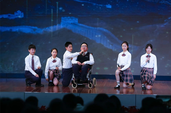 龚铖同学(右三)表演诗朗诵《月光下的中国》。