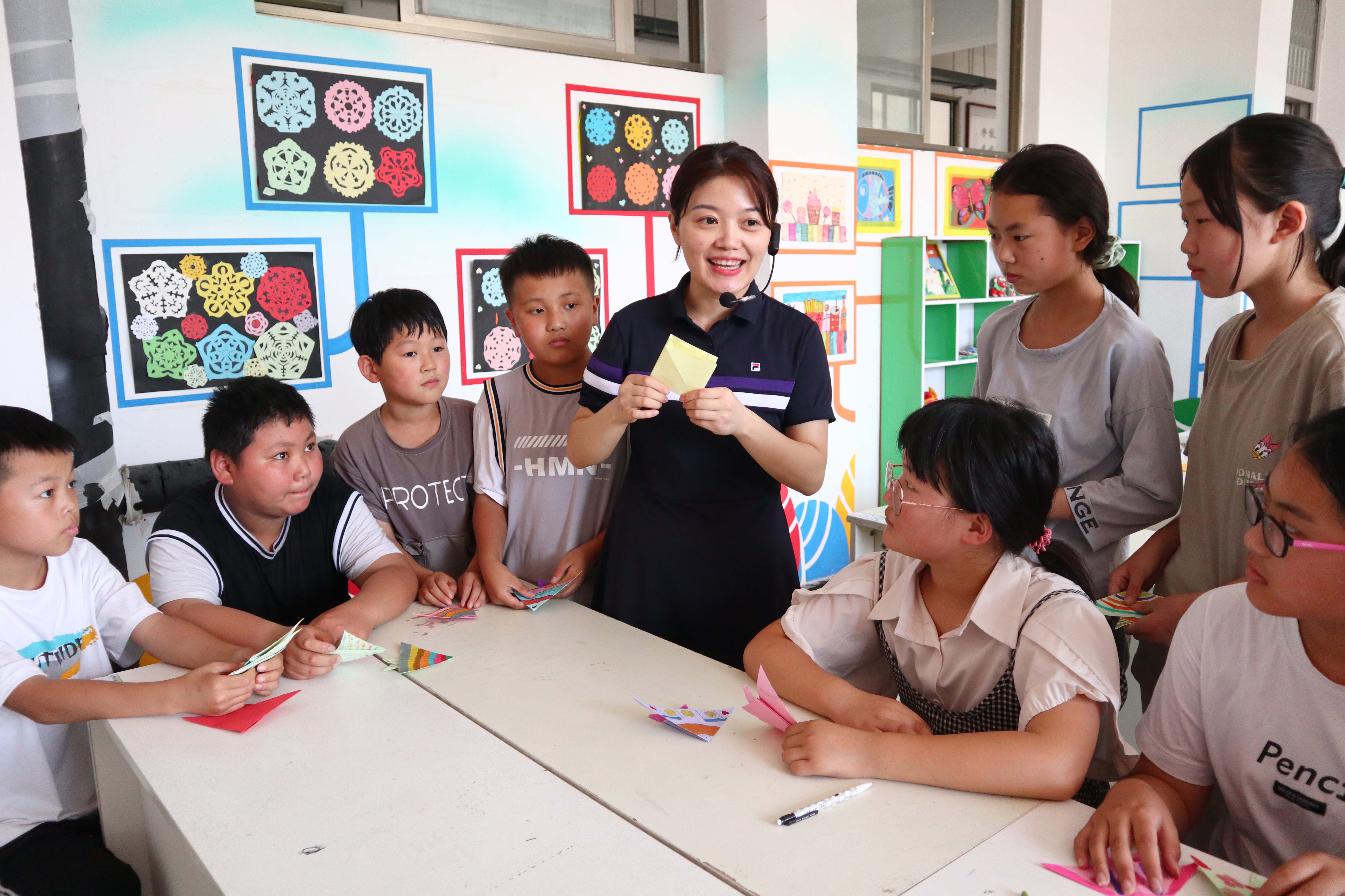 6月16日,在山东省单县黄岗镇乡村“复兴少年宫”的美术活动室,少年宫辅导员谢天予(中)在指导孩子们制作折纸作品。新华社记者 徐速绘 摄