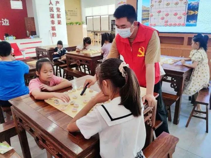 范和村乡村“复兴少年宫”象棋活动现场,志愿者指导孩子下棋。图片来源:文明惠州微信公号