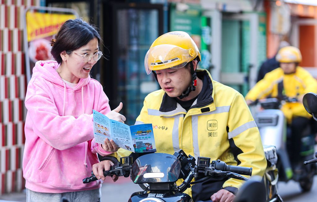 乌鲁木齐经济技术开发区(头屯河区)市民文明巡访团成员分为4个组,来到莲湖路、峨眉山街交通路口,提醒骑电动车人群佩戴安全帽、劝阻不文明交通行为,并走进周边居民小区和商铺宣传食品安全和光盘行动。