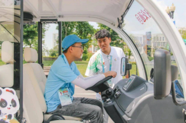 “大运村村内共有10个交通点位,每个点位配备12名交通助理,主要负责村内运动员环线班车引导、运动员上下车指引等工作,同时在点位上为运动员解答疑惑,解决一些问题。”工作间隙,熊垚告诉记者,每个站点的交通助理实行轮班制,平均工作时长四五个小时。“除了岗位上的既定工作,我还会时不时地观察一下站点人流情况、周边是否安全等。”