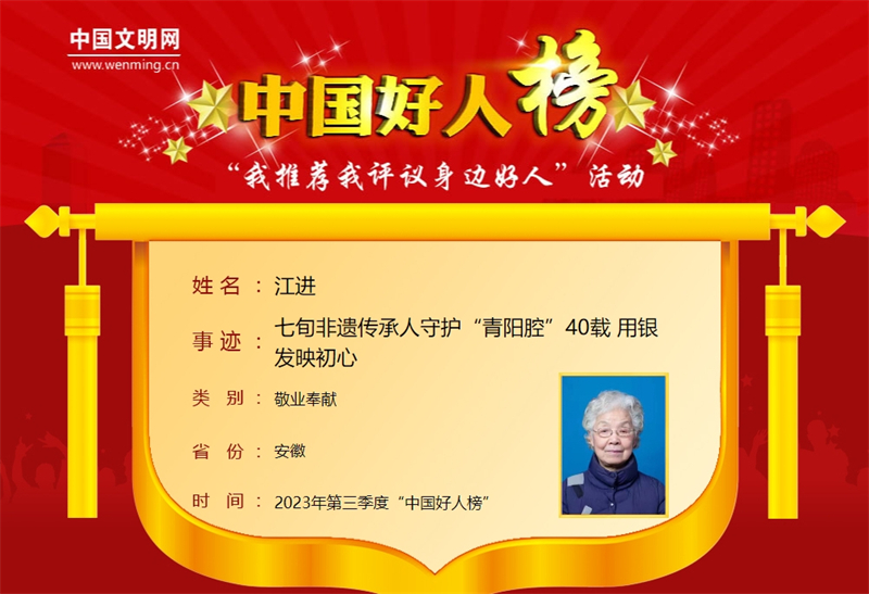 上世纪九十年代,江进放下热爱的黄梅戏工作,积极带头抢救、挖掘、研究青阳腔,推动专题片及舞台作品的推出、发行,使青阳腔从濒临失传到再次焕发青春。退休后,江进充分发挥特长,以传、帮、带多种形式培养青年文艺人才,为宣传推广青阳腔注入新活力。