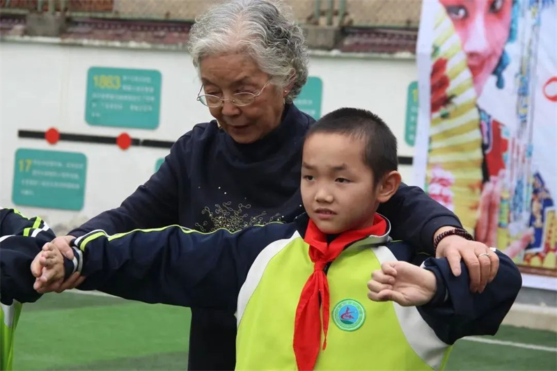 江进教小学生训练青阳腔程式动作。安徽省文明办供图