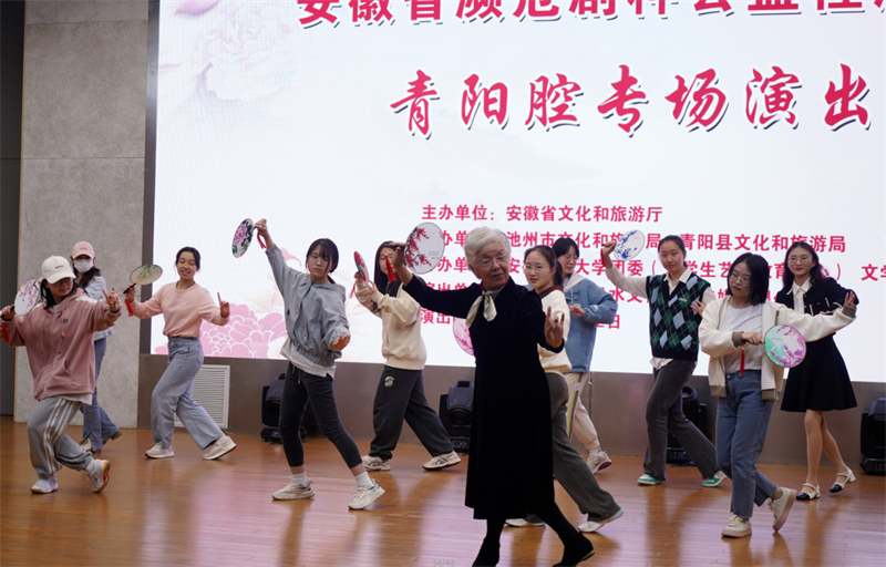 江进给大学生们传授青阳腔表演动作。安徽省文明办供图