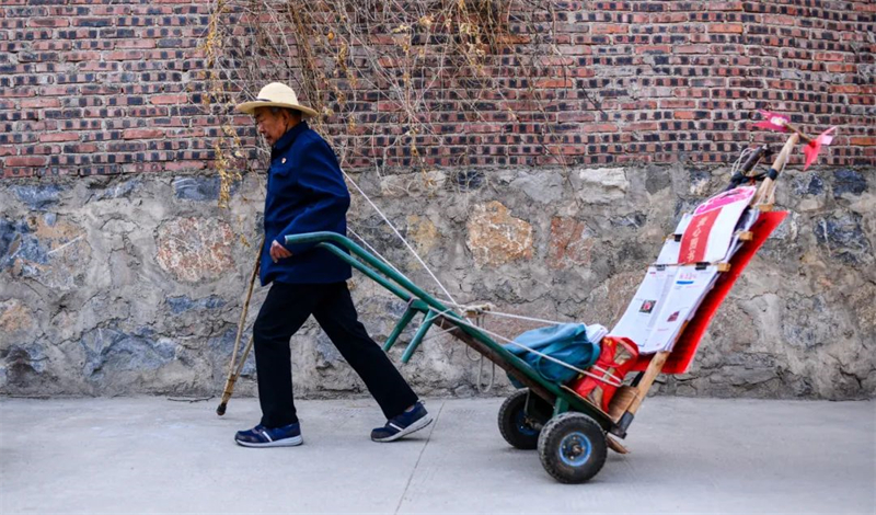 李存德拉着车前往农家书屋装书,准备出摊。新华社记者 江文耀 摄