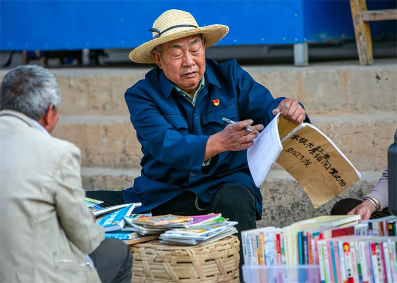 李存德在红星村的爱心流动书摊查看借阅登记信息。新华社记者 崔文 摄