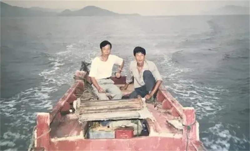 年轻时的王忠德(左)坐船去小岛。图片由受访者提供