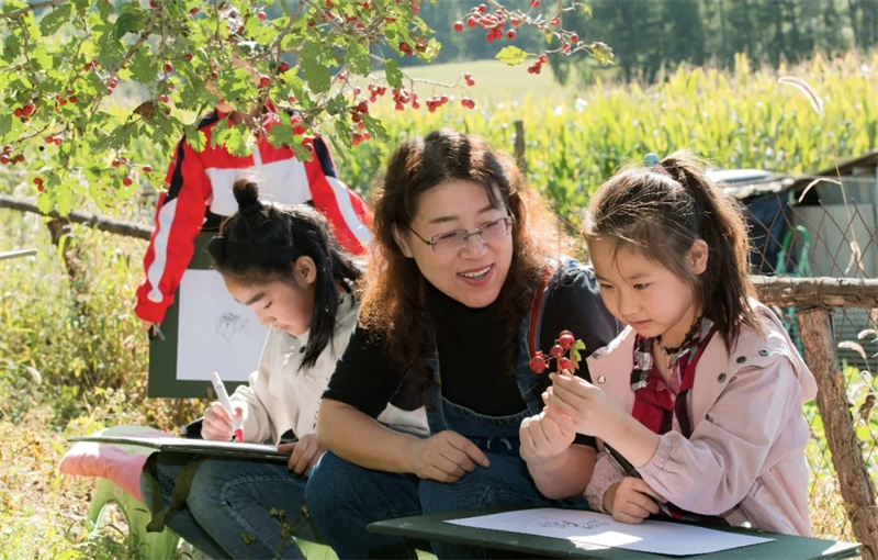 山楂树下,王晓野老师和孩子们画山里的红果果。吉林省文明办供图