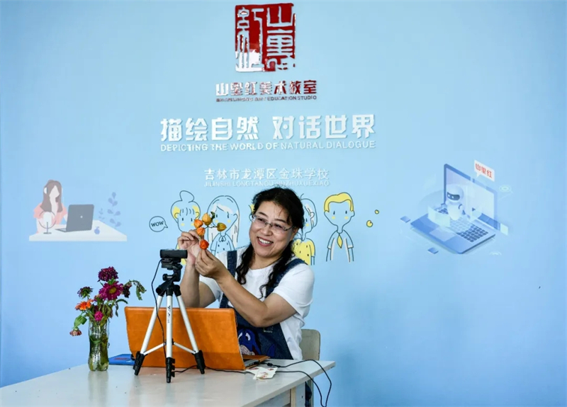 王晓野老师在美术教室里直播教学。吉林省文明办供图