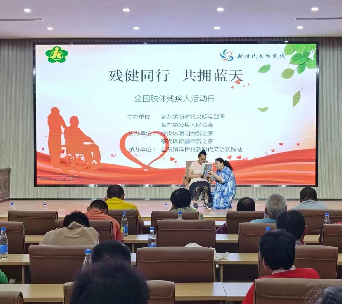 为大力弘扬人道主义思想,倡导扶残助残的社会风尚,营造团结互助、平等友爱的社会环境,带动更多的残疾朋友积极参与到社会建设中来,推动残疾人事业的发展,8月10日下午,盐东镇新时代文明实践所、盐东镇残联联合洋桥村新时代文明实践站成功举办了一场以“残健同行 共拥蓝天”为主题的联谊文艺演出活动。整场活动演出精彩纷呈,高潮迭起,赢得观众阵阵掌声。此次助残日活动,给残疾人朋友打造了一个展示才艺的平台,向他们传达了一种“自尊、自信、自强”的信念,同时告诉他们要珍惜当下的幸福生活,心怀感恩之情,好好构筑属于自己的幸福梦。