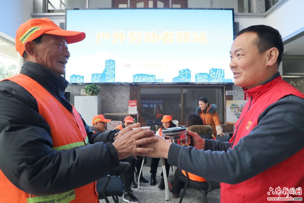 12月12日一早,美团骑手姚芹芳和同事从安徽瑞炫六安北塔驿站工作人员手中接过一杯热腾腾的红枣姜茶,轻轻抿上一口,一股热流瞬间暖在胃里也暖在心上。与此同时,市总工会的志愿者为正在工会驿站休息的环卫工人卢万明续上一杯热茶。