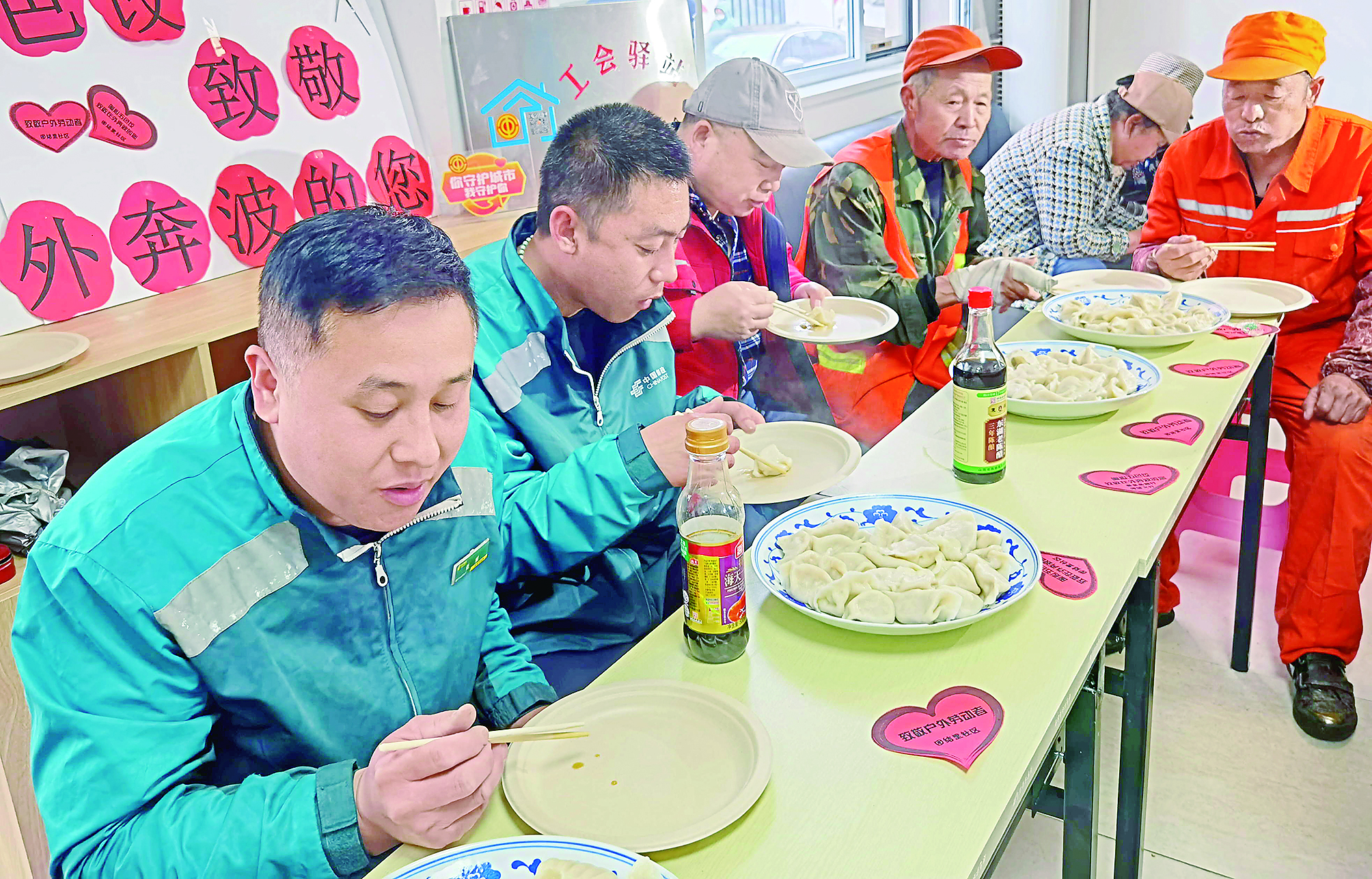 4月23日下午,在海港区beplay官网app 路街道团结里社区工会驿站,环卫工人、快递小哥们围坐在一起吃饺子。在“五一”国际劳动节即将来临之际,团结里社区开展送温暖活动,社区工作人员和志愿者包饺子送给环卫工人、快递小哥、送水员等户外工作者。(秦皇岛日报 记者方竟凯)