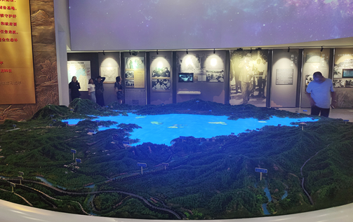 展览以水库建设发展为主线,通过老照片、场景还原、多媒体互动、声光电配合等多种手段,讲述了密云水库的前世今生。“为解决潮白河水患并破京津‘水荒’困局,1958年,由周恩来总理亲自勘定坝址、京津冀20多万民工参建的‘千年工程’密云水库正式开建。经过艰苦奋战,历经700多个日日夜夜,密云水库最终在1959年实现拦洪,次年9月建成,铸就一座新中国历史上的治水丰碑……”随着工作人员介绍的不断深入,一段段珍贵的历史影像、一个个可歌可泣的故事展现在眼前,展示密云人民建设和守护密云水库作出的贡献与努力。