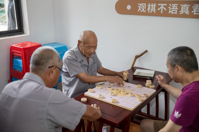 7月24日,正在湖北省荆门市掇刀区白庙街道月亮湾社区党员群众服务中心里休闲娱乐的社区居民。新华网 钟奕 摄