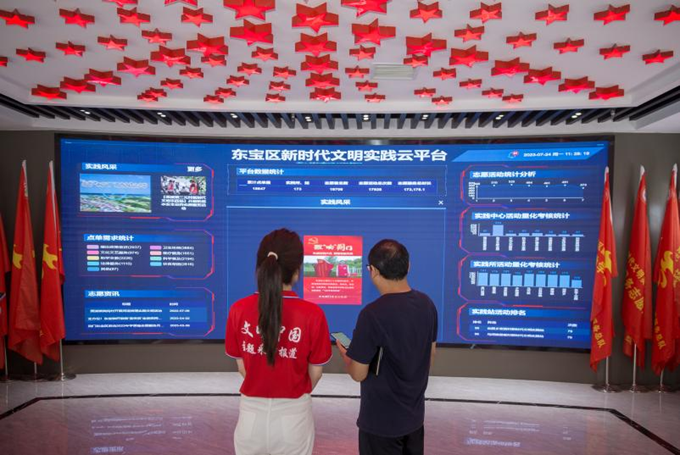7月24日,湖北省荆门市东宝区新时代文明实践云平台工作人员在向采访报道组展示志愿服务系统。新华网 钟奕 摄