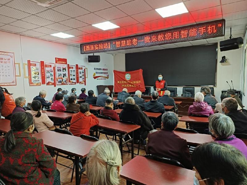 2023年2月21日,厦门同安区新时代文明实践志愿服务总队组织在西溪社区居家养老服务站开展“智慧助老—我来教您用智能手机”志愿服务活动。(地方媒体供图)