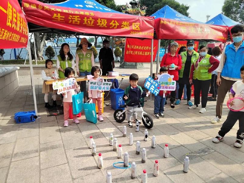 2023年4月15日,厦门市海沧区嵩屿街道新时代文明实践所乐群社工垃圾分类项目组在京口岩小区篮球场开展生活垃圾分类宣传志愿服务。(地方媒体供图)