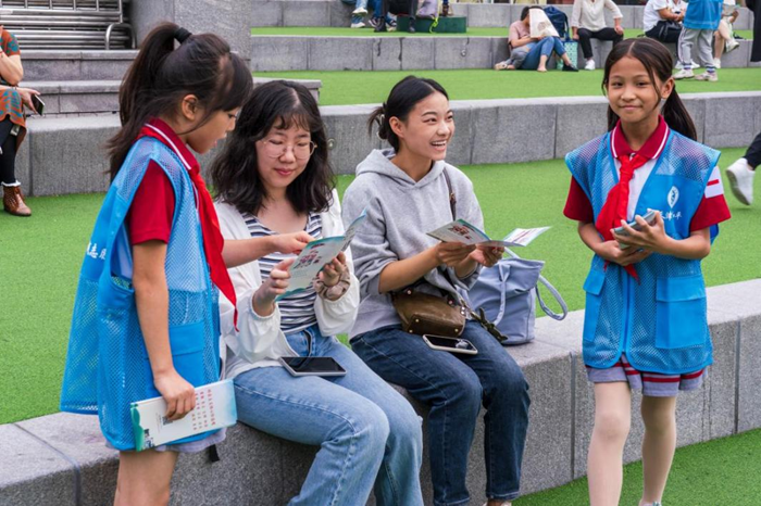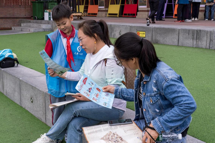 9月27日,来自天津市和平区新华南路小学的小志愿者们在天津市五大道beplay官网app 旅游区向游客宣传“争做文明有礼天津人”。新华网 钟奕 摄