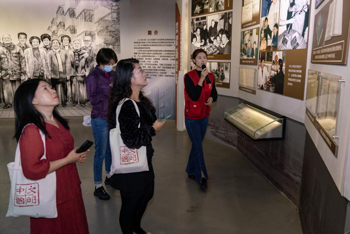 9月27日,在天津市和平区朝阳里社区志愿服务展馆,社区志愿者向“文明中国”主题采访报道组介绍三十多年来社区志愿服务的发展情况。新华网 钟奕 摄