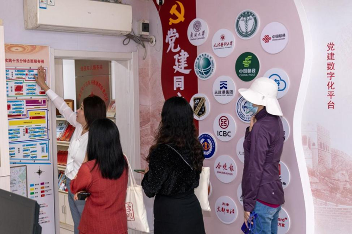 9月27日,天津市和平区朝阳里社区党委书记、居委会主任苗苗向“文明中国”主题采访报道组介绍社区的新时代文明实践十五分钟志愿服务图。新华网 钟奕 摄