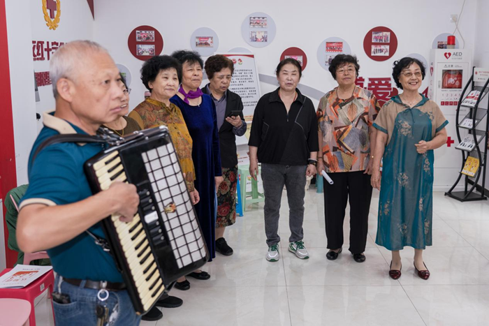 9月27日,在天津市和平区朝阳里社区老年人活动室,社区志愿者们正在开展文艺活动。新华网 钟奕 摄