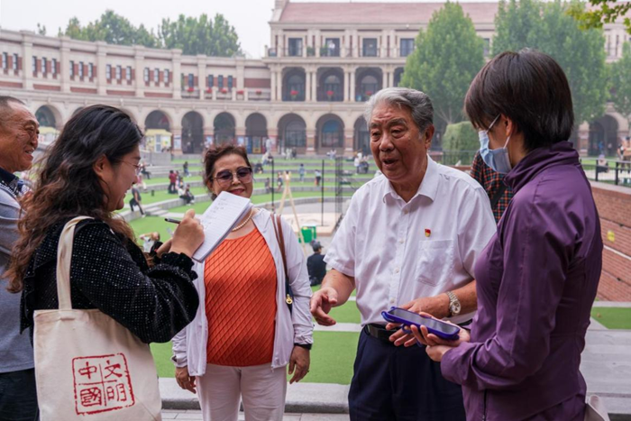 9月27日,耄耋之年的天津市五大道文明旅游志愿者张振东正在为小学生们讲解五大道的历史故事。新华网 钟奕 摄