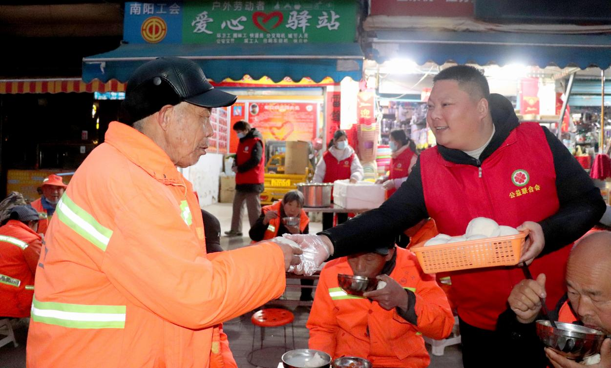资料图:“中国好人”、南阳市卧龙区志愿者联合会会长史英超为辖区环卫工人免费提供爱心粥。(南阳市文明办供图)