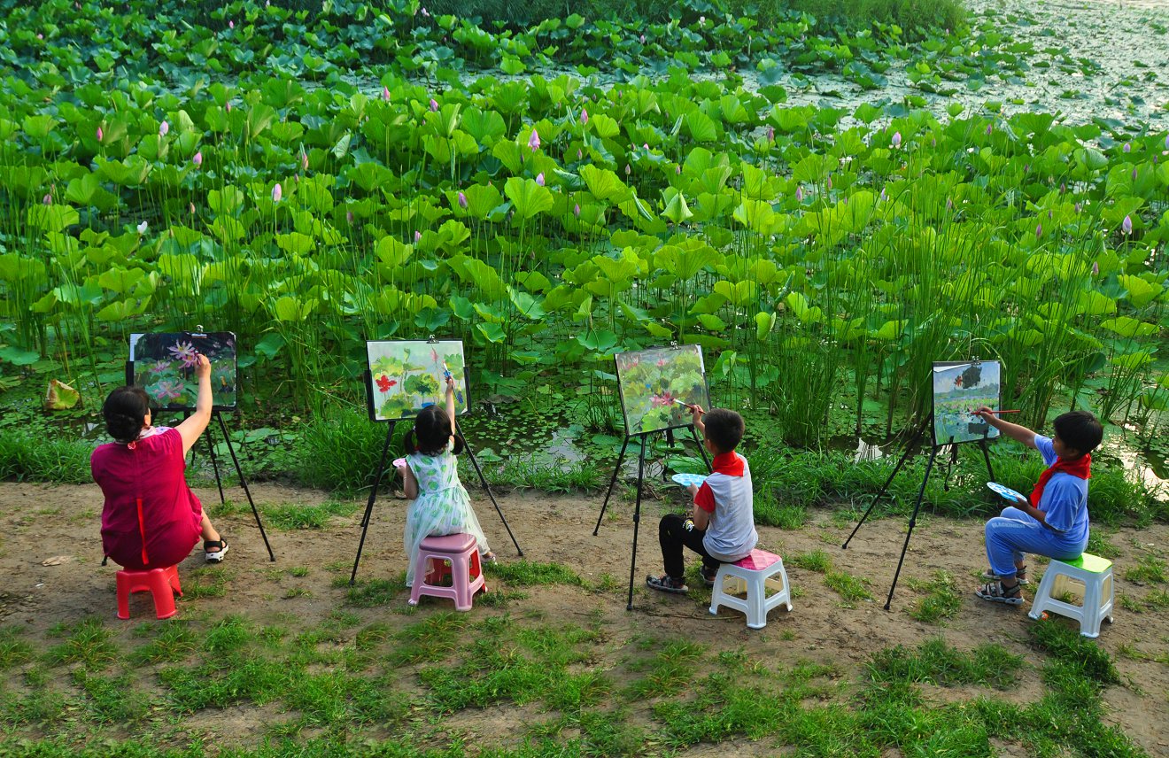 孩子们在犁桥村水塘边用笔描绘荷花绽放的美丽,描绘生态环境的美好。安徽省文明办 供图