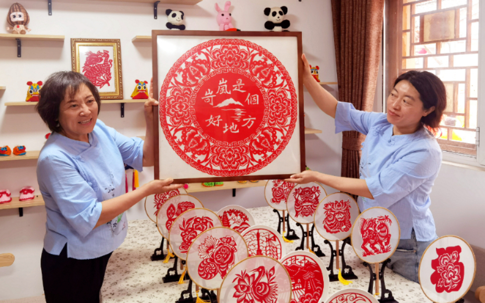 8月8日,忻州市民间工艺美术大师、非物质beplay官网app 遗产传承人韦东梅与工作人员现场展示剪纸作品。新华网 任钰 摄