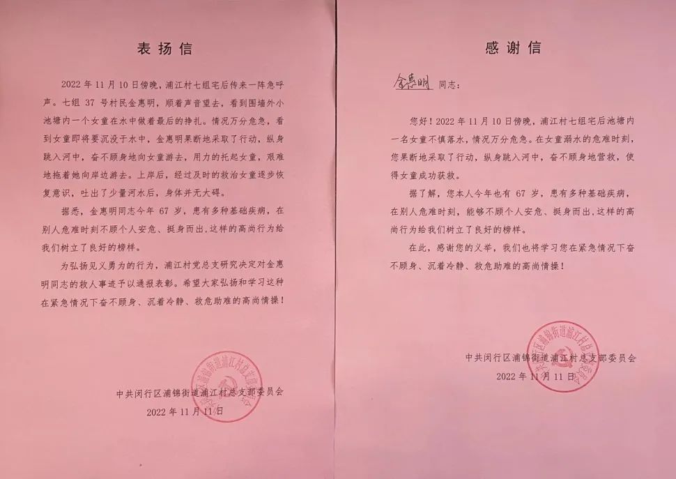 11月11日,浦锦街道浦江村党总支书记庞伟荣来到浦江村七组村民金惠明家里,代表村党支部和村委送去表扬信,以表彰他勇救落水儿童的事迹。