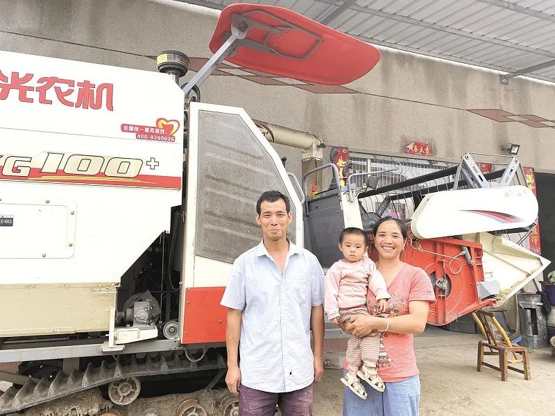 赵福兰抱着小孩,与丈夫石红波在家里的大型收割机前合影。图片来源:湖北文明网