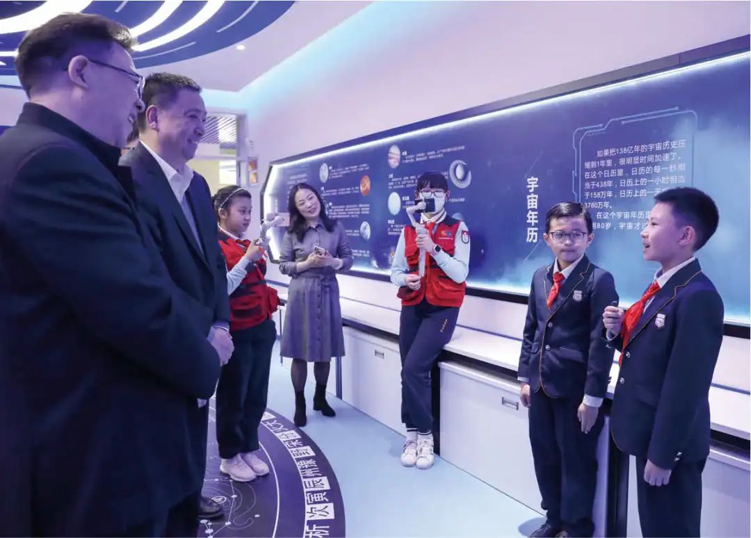 航天体验教室启用,红领巾宣讲员向前来参加启动仪式的上海航天局领导介绍“体验区”和“探索区”等
