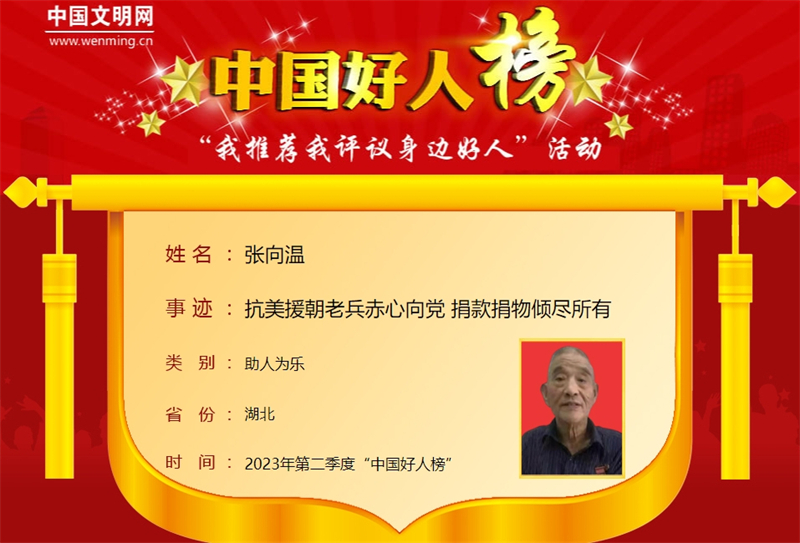 2021年,庆祝建党一百周年前夕,张向温以一名老党员的身份,向湖北咸宁市红十字会捐款6万元。张向温很坚定:“我是一名共产党员,是党养育了我,我愿用一切回报党。”