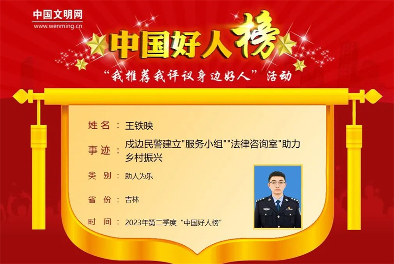 2020年,王铁映充分借鉴新时代“枫桥经验”,创立吉林省边境地区首支警企民协作的边境警务志愿队伍——义警工作站,率先启动民、辅、义“三警”群防联控模式,搭起“三位一体”社会化警务新格局。“义警工作站”组建来,共开展巡防470余次、普法宣传320余次,化解纠纷100余起,彻底纠治了村民酗酒滋事、聚众赌博等现象,纠纷调处率、村民满意度达100%。“义警工作站”经验做法被吉林省委改革办推广。