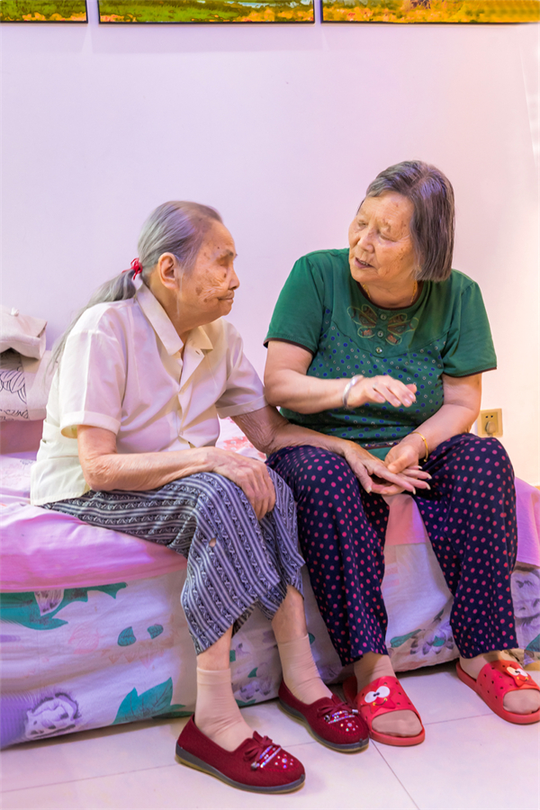 清晨,江苏省南京市江北新区长芦街道芳庭潘园小区,秋日的阳光洒进屋中,在一间朝南的卧室里,头发花白的沈桂华正用一根红绳给97岁的姐姐沈萃萍扎马尾。