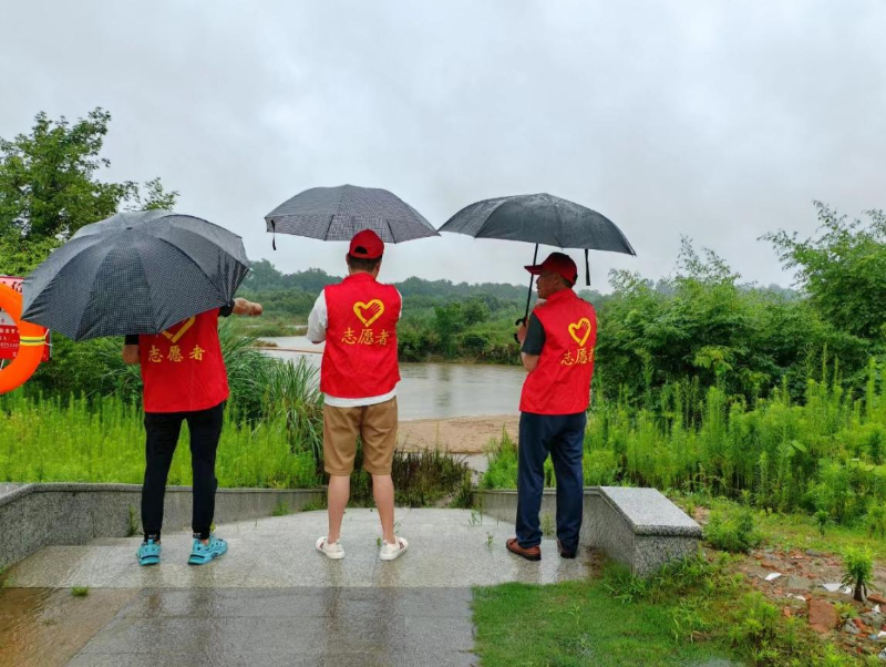 6月27日,潜山市王河镇皖潜村青年志愿者在潜河和茅岭河开展堤坝巡查排险。