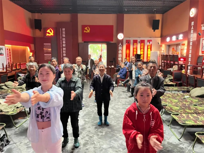 黄山市徽州区富溪乡新时代文明实践所的临时安置点内,志愿者带着群众做健身运动。